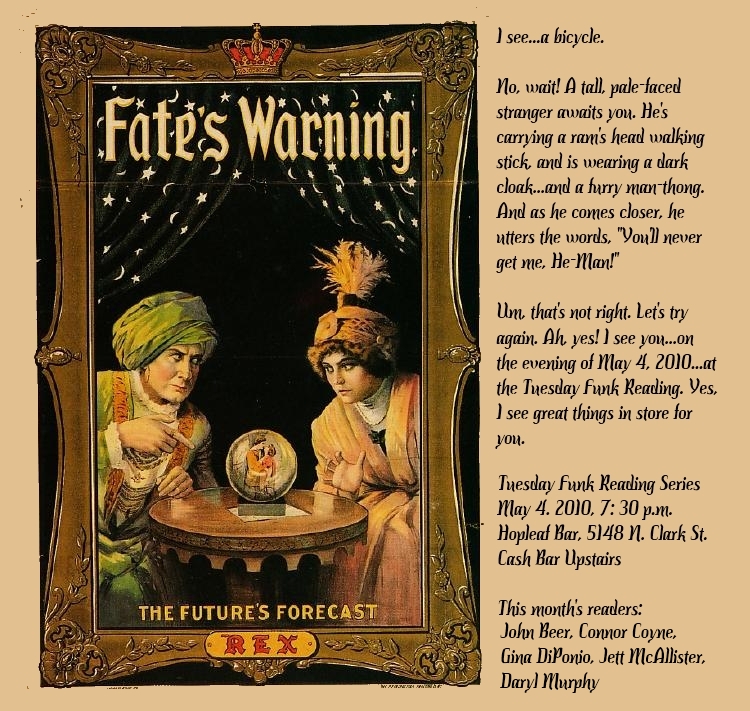 I will be reading from Hungry Rats at the 23rd installment of the Tuesday Funk reading series in Chicago. My co-readers will be John Beer, Gina diPonio, Jett McAllister, and Daryl Murphy. Come on out to the Hopleaf, and join us for a drink and a read!